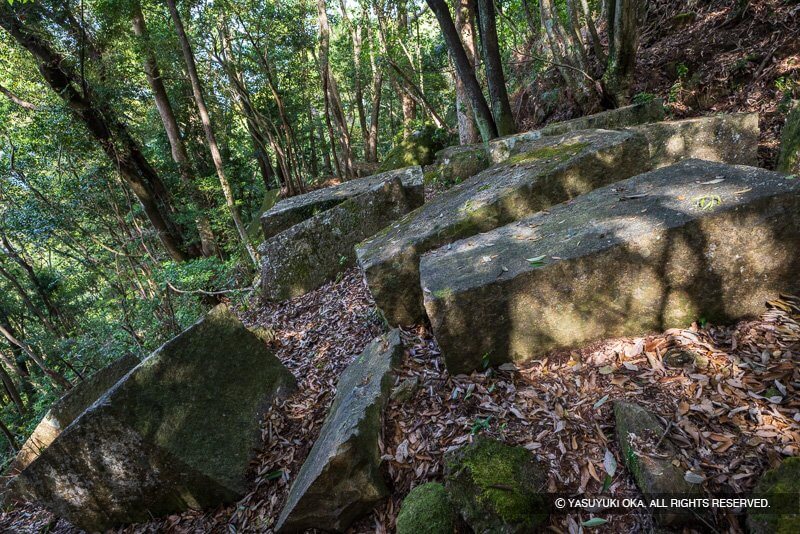 小杉C石切場。長さ2mほどの調整された24石が並ぶ。かなりの規模感だ。平坦地が設けられ石が置かれているが、斜面の石曳き道に向かって傾斜している。