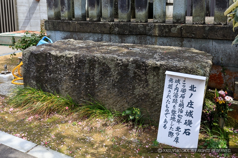 北ノ庄城の石垣の一部、石列遺構は南北方向に並んだ30〜50cm大の笏谷石6個など。笏谷石はその特性から風化の恐れがあり、表面に薬を塗って保存してあるそうな。凝灰岩のことで加工がしやすい石。このあたりでは、福井市にある足羽山(あすわやま)笏谷の石切場が有名なため「笏谷石」と呼ばれている。