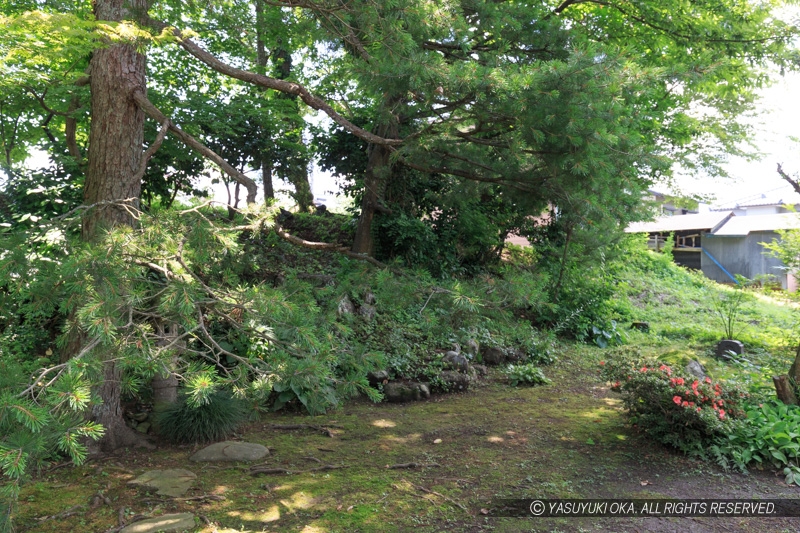「武家屋敷旧田村家」は、大野藩家老、田村又左衛門の屋敷で2015年から公開された。文政10年(1827)の大火の後に、矢村の農家を移築し、武家住宅に改築している。庭園の築山が大野城外堀の土塁で、ここにのみ残っている。武家屋敷旧田村家の駐車場からも土塁が見られるが、旧田村家に入ると綺麗に見られるぞ。城ファンには是非訪れてほしい場所だ。