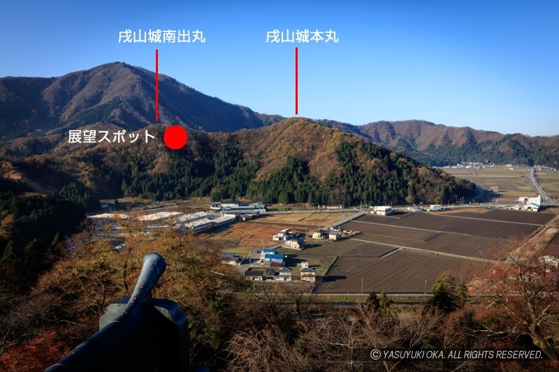 越前大野城の西、約1kmにある戌山(戌山城址・標高324m 比高160m)の南出丸下から見られる。近年、ラピュタの会や大野市、地元の方々の手によって、南出丸付近の木々を伐採し眺望が良くなっている。この山には、登山道を徒歩で登るしかないため、ハイキングレベルの装備がほしい。