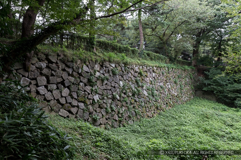 ずばりその見どころは、本丸にかかる土橋の石垣。ちょうど本丸に渡った左手から堀底へ降りる階段があり、刻印石などよく見られる。