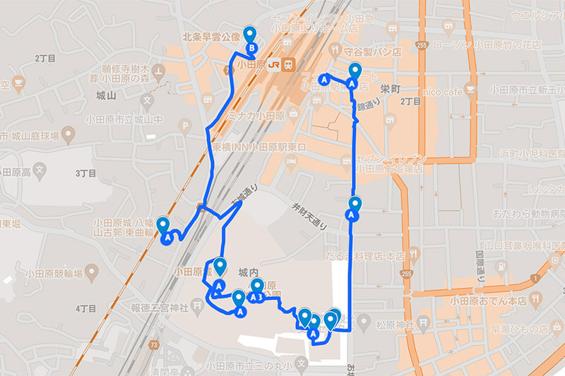 初めて小田原城を訪れたなら、主要部を中心に観るのが良いだろう。初級編の散策ルートをGoogleマップで解説。