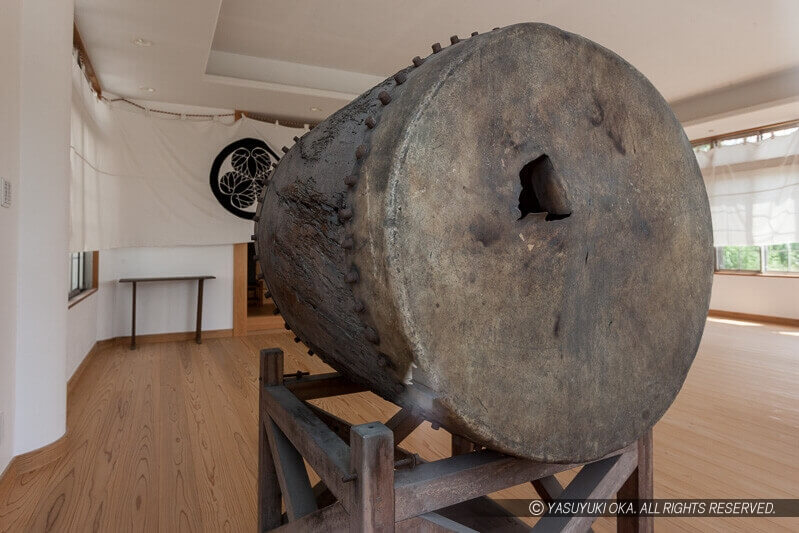 武士の姿をしたロボットが時をうつ「とき打ち太鼓」。明石城太鼓門に据えられた時刻を知らす太鼓で、明石城太鼓門脇にあり、当時と同じ数で一刻(2時間)に一度、太鼓をたたいてくれる。なお、当時の太鼓は、城の東側にある明石神社に保管されているからこちらも見ておこう。明石神社は、明石城内に徳川家康を祀ったのが始まりで、大正7年(1918)に、現在位の場所に移された。阪神淡路大震災でダメージを受けて後、地元の反対もあったが境内の土地を一部売却し再建されている。社殿の中に入ることはできないが、ガラス越しに当時の「とき打ち太鼓」を観ることができる。