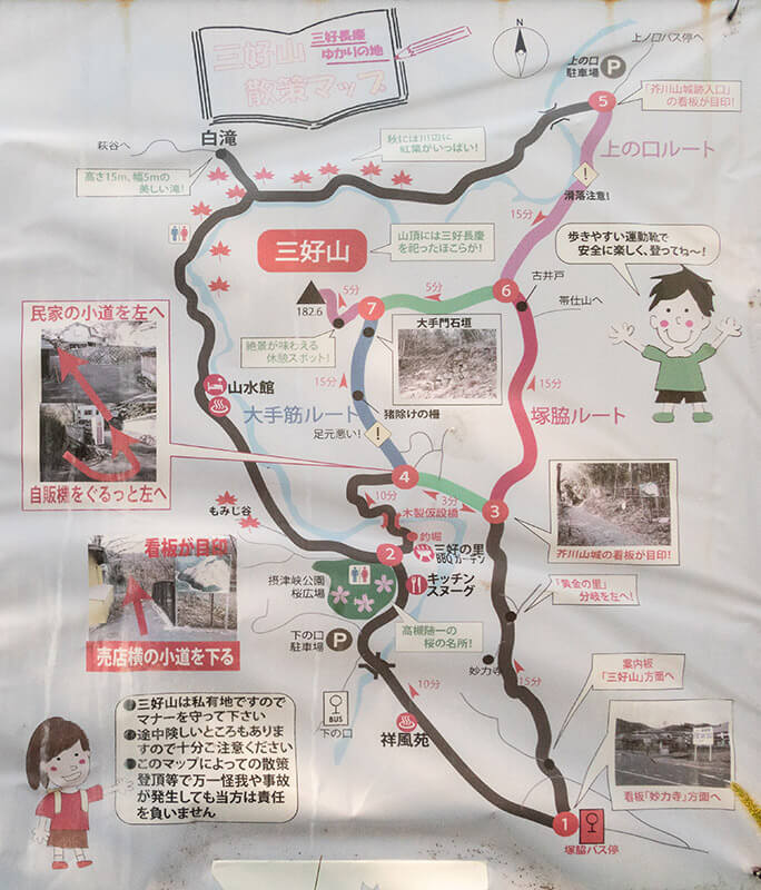 「塚脇ルート」「大手道」利用の場合は、バス停「塚脇」に縄張図を掲載した解説板がある。「上の口ルート」はその登山口に、大きく拡大された縄張図と解説がある。さらに詳しくは、高槻城近くの「高槻市立しろあと歴史館」へどうぞ。