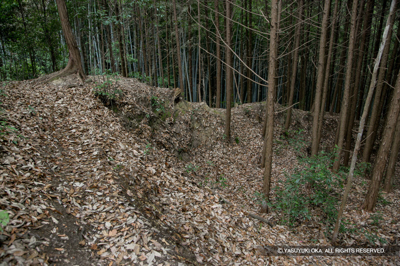 東屋敷群と東郭群の間や、主郭の北西部などに、尾根を遮断する堀切と土橋が設けられている。外部からの侵入を防ぐ役割を果たしていた。田の丸下の大土塁も見応えがある。