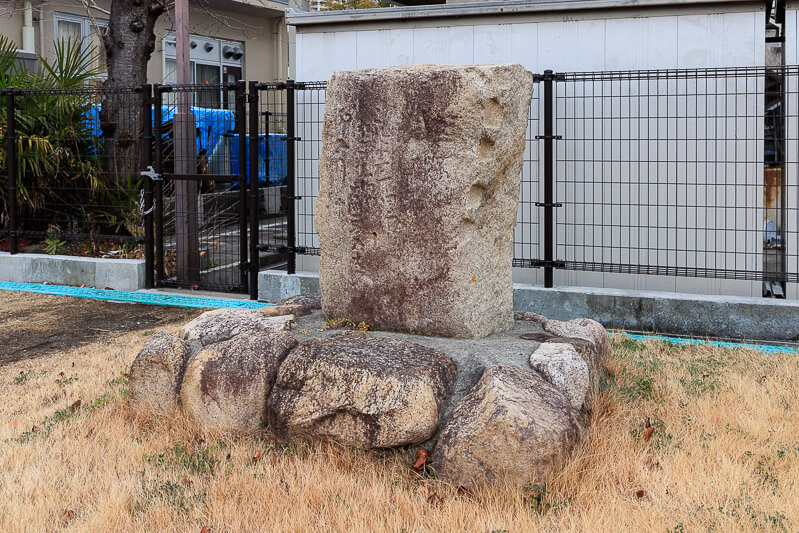 尼崎城本丸跡に建つ尼崎市立成良中学校琴城分校の敷地内に残る、徳川大坂城築城期に東六甲石丁場で使われていた境界石(非公開)。特別に見せていただいた。「これ上五丁四方 松平長門内 ○○○○○ 卯五月 十」と刻まれている。卯五月は寛永4年(1627)を指すらしい(尼崎市立地域研究史料館紀要『地域史研究』)。これは尼崎城ではなく徳川大坂城築城期のもので尼崎城本丸跡にある経緯は分かっていない。尼崎城が二度の震災で修理が必要になった時、その領地である東六甲石丁場から、残念石などを運び入れ、その際に持ってきたのではないかという説がある。文字入りの境界石は兵庫城付近にあるものとここの2つのみらしい。