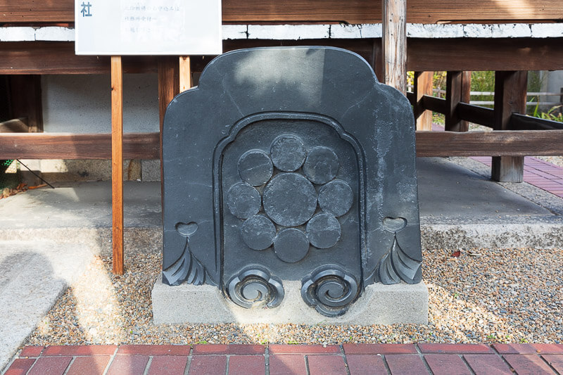 大物公園に屋外展示されている尼崎城の刻印石(二つ串団子)。本丸の堀で使われていた。地面に接している方が面。尼崎城では刻印石はこのほか数例しか無いらしい。これらの石垣石は、尼崎城址公園、寺町、市街地に残るものを上記ページで紹介している。