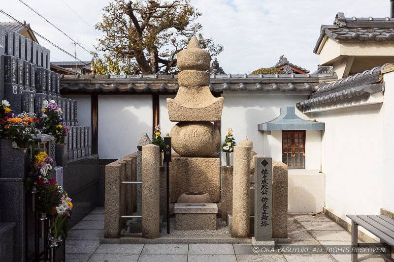 尼崎城から西に徒歩8分、600mの距離に「寺町」という臨戦時に砦として機能する地域があり、藩政時代からの古い寺院が11か寺が残されその区割りも当時からさほど変わっていない。この寺町の法園寺に佐々成政の墓がある。天正16年(1588)に法園寺で切腹、ここが終焉の地となる。境内にある墓碑は複製で、本堂内に五輪塔が保存されている(非公開)。法園寺は尼崎城築城に際し、別所町から現在の寺町に移されたのだそう。観光案内所の話によると、法園寺の山門が空いているときはその五輪塔を見ることができる。余談ながら法園寺の前に、たこ焼き屋があるが、14個で200円というびっくり価格、コストパフォーマンスがすこぶる高いお店だった。