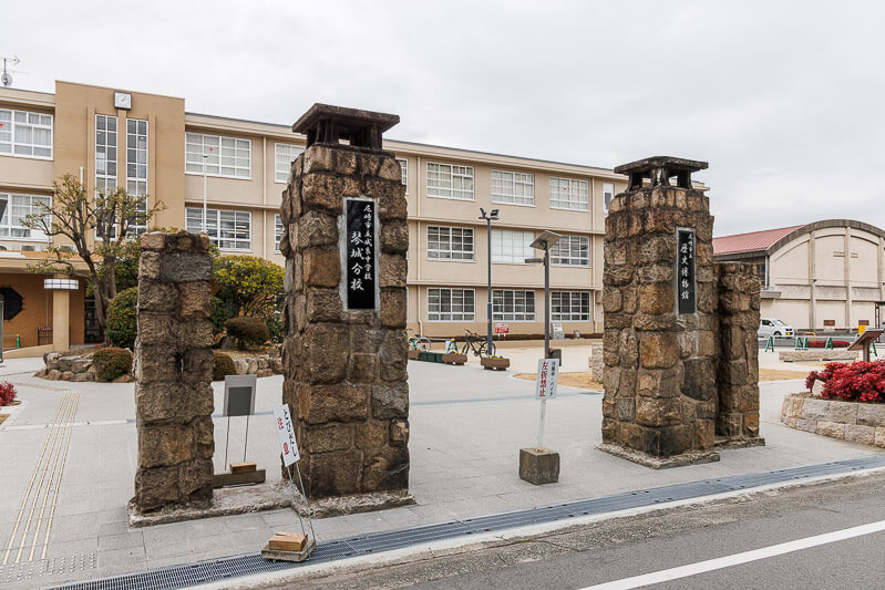 明城小学校(尼崎城本丸跡)の二宮金次郎の台座は矢穴石(石材右側に矢穴痕)。矢穴サイズから築城時の石垣石。その形から上面が石垣表面とされる。