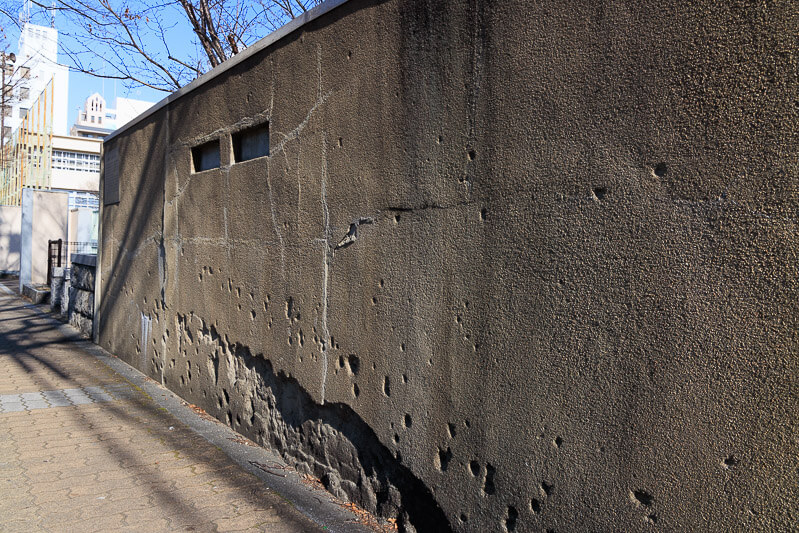 尼崎開明中公園にある米軍戦闘機によって攻撃された小学校の壁に残る機銃掃射の跡。