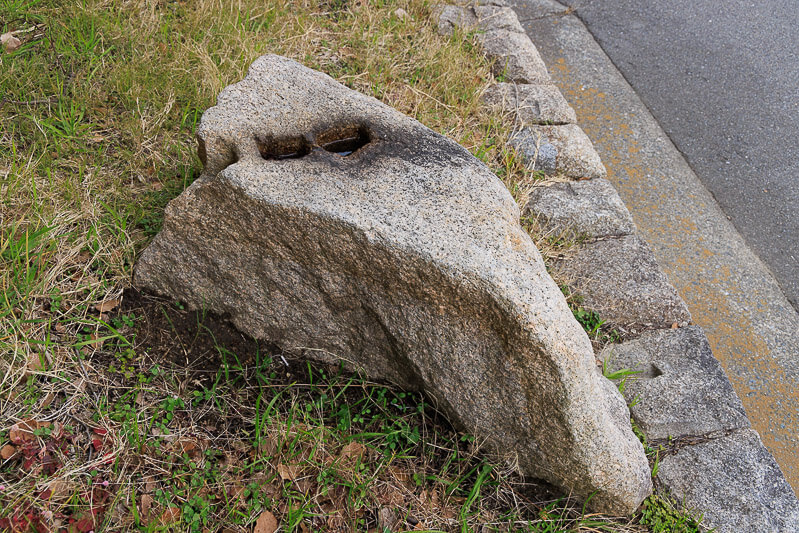 尼崎だいもつ病院のロータリーにある矢穴石。付近にもうひとつ矢穴痕のある石がある。