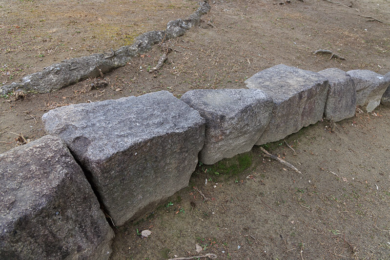 尼崎の西川公園に残る矢穴石。矢穴痕がついた石は2石ある。