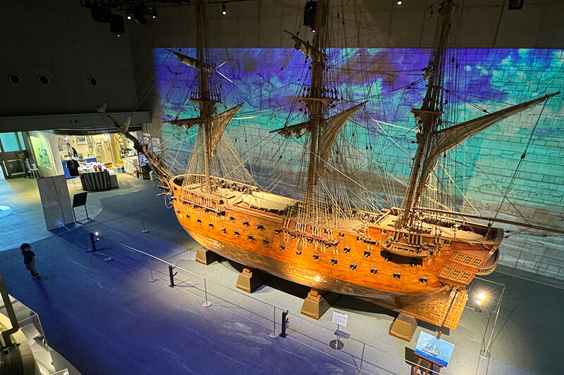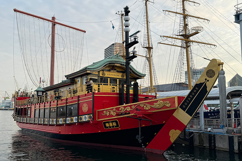 神戸港の観光船「御座船安宅丸」。江戸幕府3代将軍家光の命で造られた安宅丸をモチーフにしている。徳川の家紋がちりばめられ、JR九州「ななつ星in九州」のデザイナーが手がけた船内も美しい。2021年まで東京湾のクルーズ船として活躍していたが、同年10月より神戸港で運航されている。