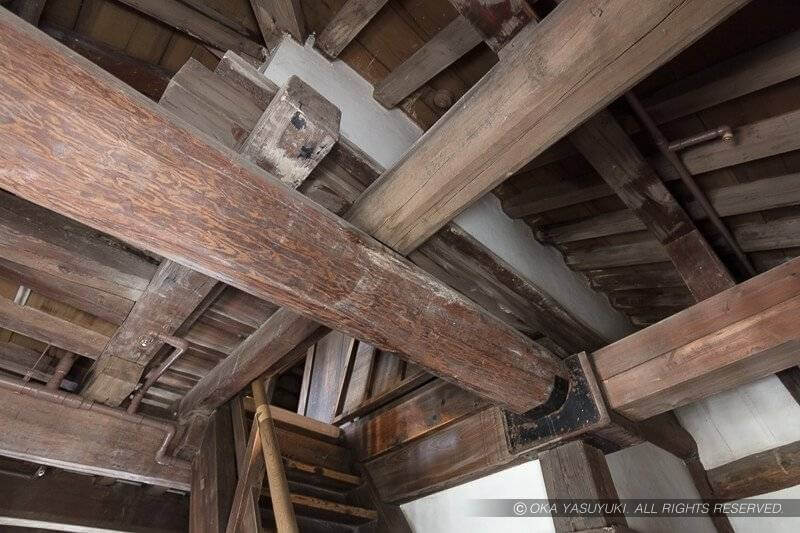 乾小天守3階は、天井高が低い。1階と2階、この二重の櫓に望楼を乗せているタイプのため二層の屋根内部に一室を設け、小天守では唯一、三層にも関わらず、内部4階建の構造となっている。
