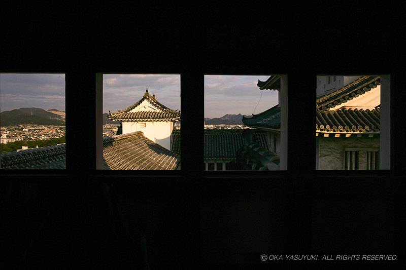 乾小天守の花頭窓は、角窓に取り付けられている(上写真)。開放的な窓は、まるで防御を考えていないかのようだ。この花頭窓から、屋根に出ることができる。平時の屋根のメンテナンスはここから出て行われていたのではないかと思われる。