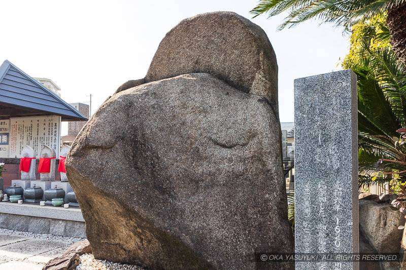 なぜか全くといっていいほど知られていないが、イオンモールの西隣りに「阿弥陀寺」がある。その境内に「加藤肥後守石場これより南ひがし」という文字が刻印された徳川大阪城築城時に石丁場で使われていたと思われる巨大な境界石がある。大阪城(徳川大坂城)の大手口多聞櫓、千貫櫓の石垣を普請した加藤忠広のものだ。そのほか同寺院には楠公供養石なるものもある。京阪神に残る明確な文字が書かれた石丁場の境界石では、尼崎城の本丸跡に残る境界石とここの2つのみ。
