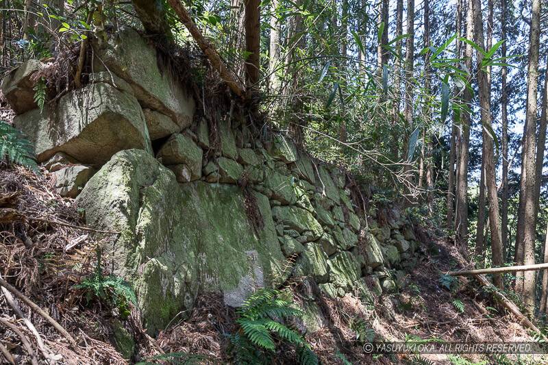 最も簡単に石垣を見ようと思えば、城域に入ると、多少、登山道が分岐しているので、それを進めば曲輪側面を歩くことができ、点在する石垣のいくつかを見ることができる。