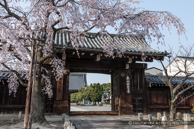 聚楽第裏門聚楽第の遺構と伝わる「妙覚寺大門」は、だれ桜が門前にあり毎年4月の第一週あたりに見頃を迎える。京都の春といえば花見客でごった返すイメージが強いが、妙覚寺の桜は、ひっそりと佇んでいるといった風情で、観光客もほとんど訪れていない。