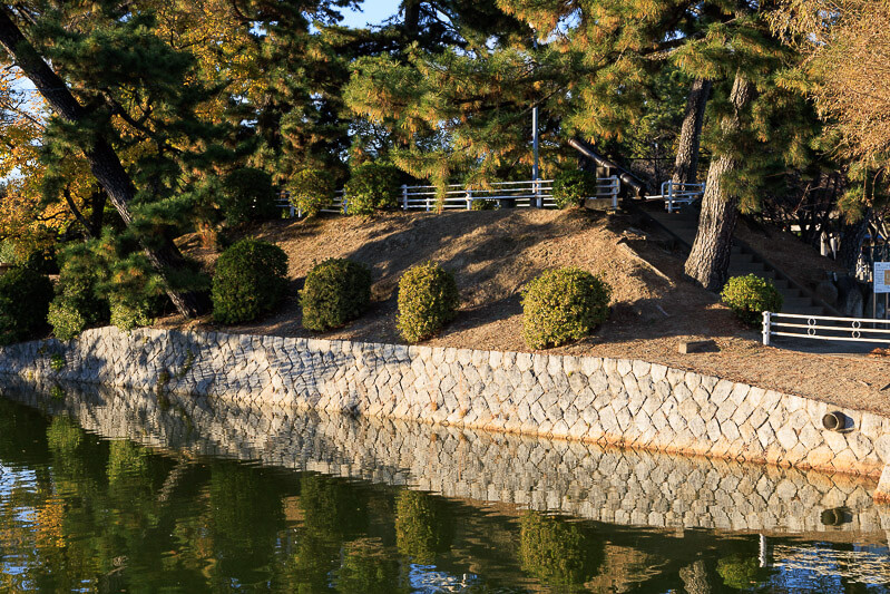 水堀と曲輪が残る桑名城。各曲輪には当時の石垣がまとわれていない。ということは、その水堀に浮かぶ陸地(曲輪)が美しい状態を捉えたい。この城は概ね午後の撮影が向いているので、夕方で水が鏡面反射する「無風」の日に訪れたい。