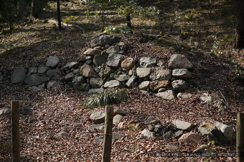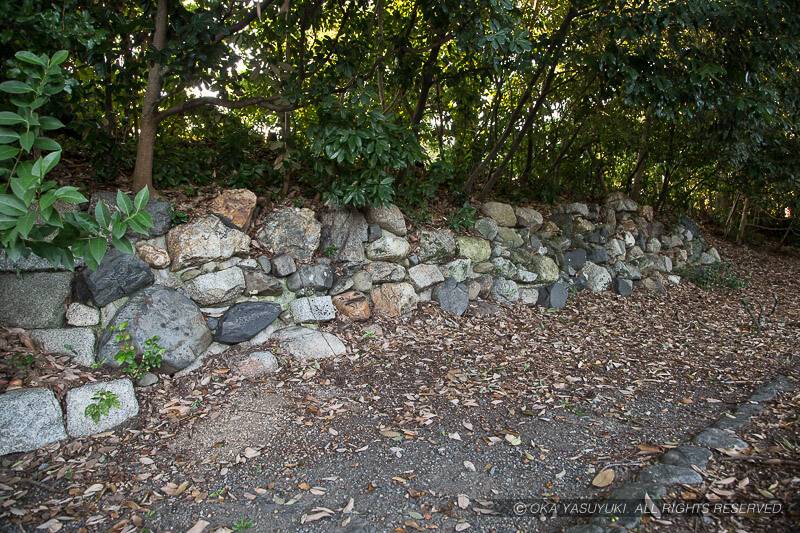 信長築城の「足利義昭将軍第 二条城」の石垣は、地下鉄烏丸線の工事で発見され、一部が現二条城と京都御苑内に移築復元されています。京都「御苑」は「御所」を取り巻く公園で、一般の人に出入り自由で開放されています。場所は烏丸通側(西)の一番南の門内北側にあり、高さ1.5メートル、幅5〜6メートルほどが移築復元されていました。石垣は野面積みで、一つだけ突貫工事だった事を偲ばせる石灯篭の一部のようなきれいに角張った(?)石がありました。単に積み上げてあるだけという感じもしましたが、初期の石垣の工法がよく分かる遺構です。