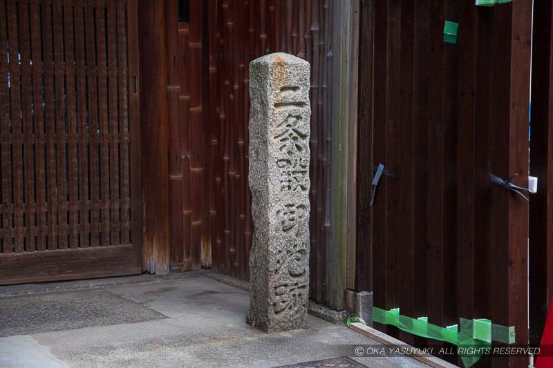二条御所は、織田信長が移り住み、後に誠仁親王に献上。本能寺の変の際には、織田信忠がここで自害している。石碑は、「二条殿御池跡」と刻まれたもののほかに「二條殿址」の計2本が付近にある。