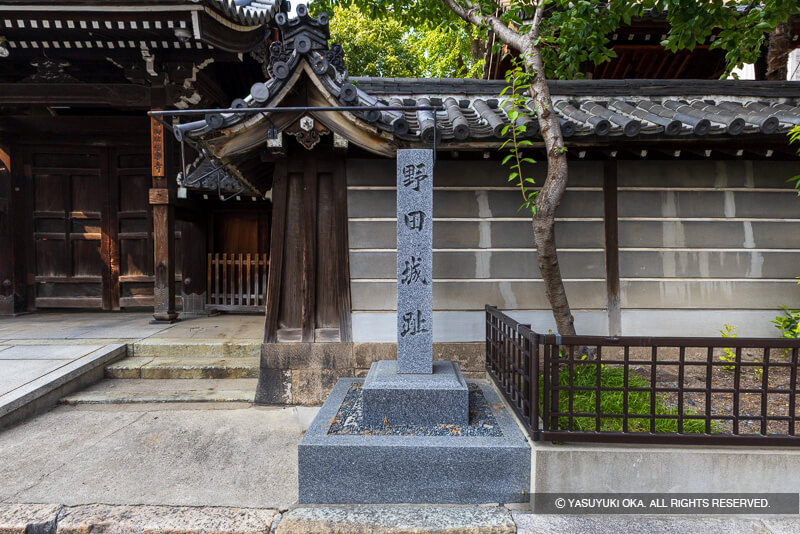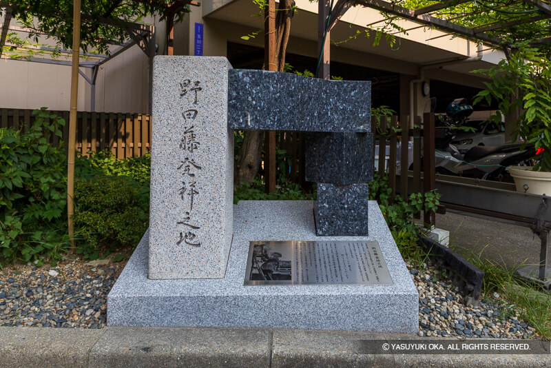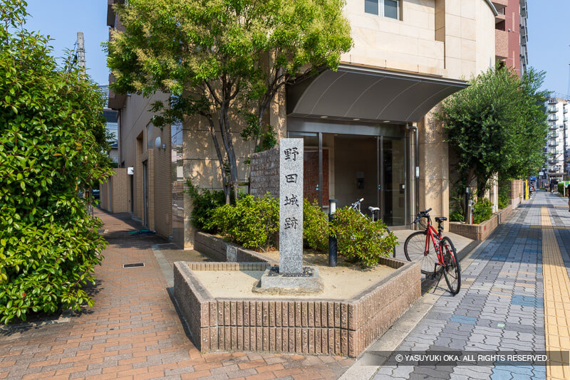 大阪メトロ、玉川駅前の住宅街に、もうひとつの「野田城跡」石碑がある。現在はマンションとなっているが、筆者が若い頃はその昔は銀行のあった場所で自転車が大量に駐められており、石碑が埋もれた風景だったと記憶している。