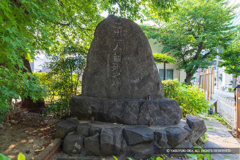 この石碑は、天文2年(1533)9月21日に野田の地で戦死した21名を弔うために建てられた慰霊碑。天文元年(1532)、一向宗寺院山科本願寺が、近江観音寺城の六角定頼に攻められ焼失、第10世の證如上人は石山本願寺に落ち延びた。翌年、石山本願寺が攻められ、野田・福島の門徒500人が背後より奇襲するも敗れ、證如上人を守護し野田から小舟で紀州へと落とした。この時、門徒21人が討死したという。この戦いから400年を経た昭和15年(1940)、西野田青年団によって慰霊碑が建立され、のちに昭和52年(1977)、下福島中学校の整備にともなって、現在の玉川コミュニティセンター敷地内へと移設された。