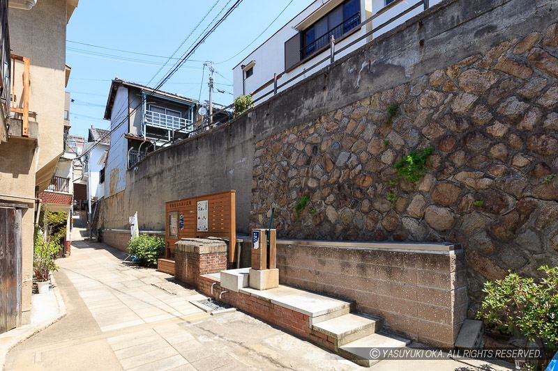 現在も使われている当時の下水(地下)。地上の覗き窓から内部が見られるような公開施設になっている。2006年に約7kmが大阪市文化財に指定された。太閤下水は秀吉時代からのものと特定されていないが、江戸時代前期からその記録があるのだとか。事前申込みで地下に入ることができる。余談だが公開施設前の南北の通りは熊野街道。さらに南下すると下記の空堀の段差がある。