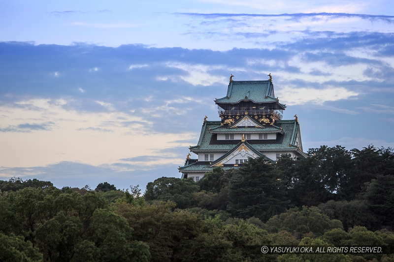 大阪城公園の北西に、大阪城ホール、野球場などがあるが、その東側に広場がある。その広場を東の方まで歩けば、天守閣が木々の上に顔を出す。周囲のビルが木々に隠れるポイントを探して1枚に収めるのも良いだろう。天守閣を東側から望むため午前であれば順光で、夕暮れでは、ドラマチックな空の風景と一緒にどうぞ。