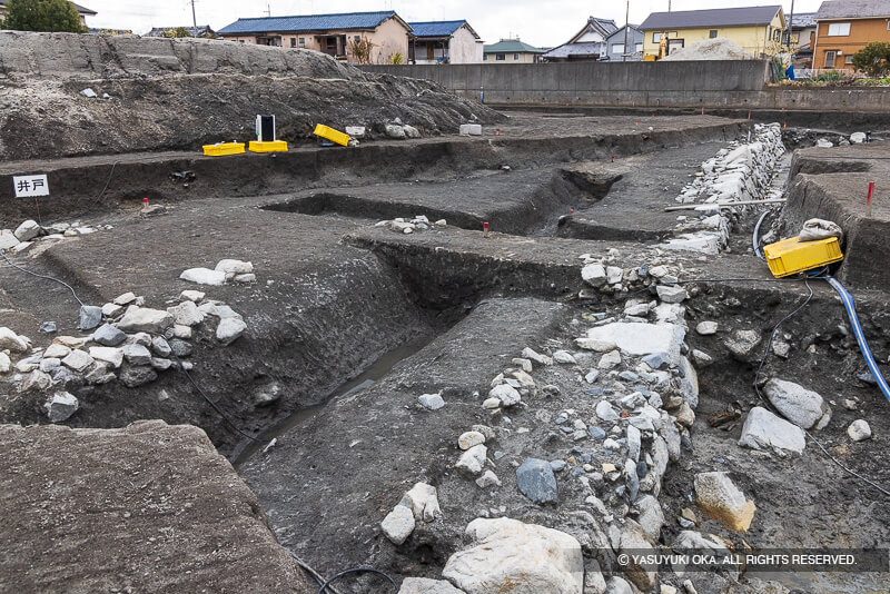 坂本城三の丸外堀石垣とその用途が解明されていない城内側の溝(2024年出土)。