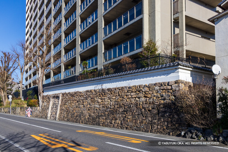城址に建つマンション「グランスイート近江・臨湖庵」に見られる瀬田城の復興土塀と石垣
