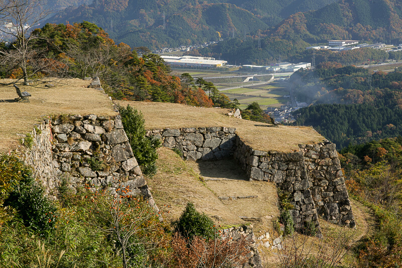 実は彦根城伊予松山城とならび、「登り石垣」が確認できる城のひとつ。といって簡単に見られるわけではなく、西側斜面に井戸跡があるがそこをさらに下らなければならない。かなり危険。
