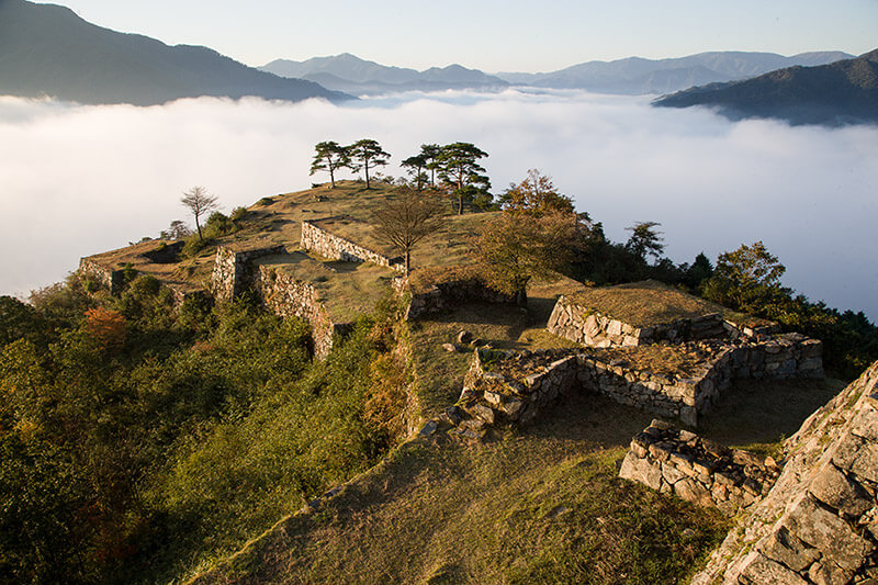 竹田城天守台から二の丸と南千畳を望む。雲海をバックに連続する曲輪が実に遺跡らしい。