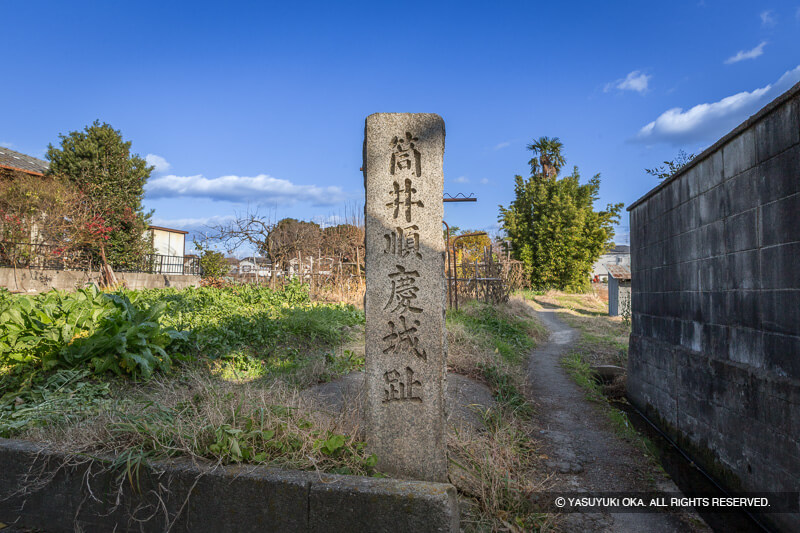 近鉄橿原線、筒井駅下車、東北へ徒歩5分で筒井順慶城址の石碑。その付近、一帯の南北400m、東西500mが城跡。筒井駅から道中に案内板も無く、まさかと思う路地を通るので、必ず上記Googleマップを参照のこと。