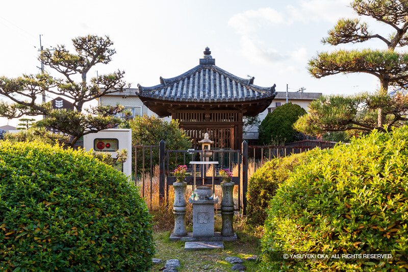 筒井順慶の墓と伝わる五輪塔覆堂筒井城を訪ねたなら、もう一つ足を延ばしておきたい史跡がある。城主・筒井順慶の墓と伝えられる五輪塔がある。場所は、近鉄橿原線・平端駅から北東へ徒歩約5分。住宅街の一角、木立に囲まれた瓦屋根の覆堂がひっそりと佇んでいる。