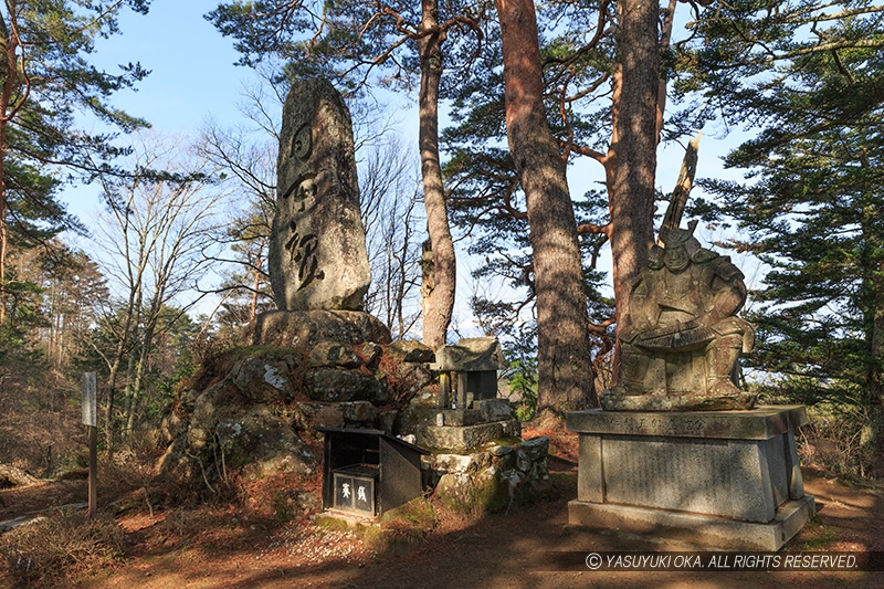 城跡の南西にある五郎山には、織田軍に敗れて自害した仁科盛信を祀った祠と石像がある。