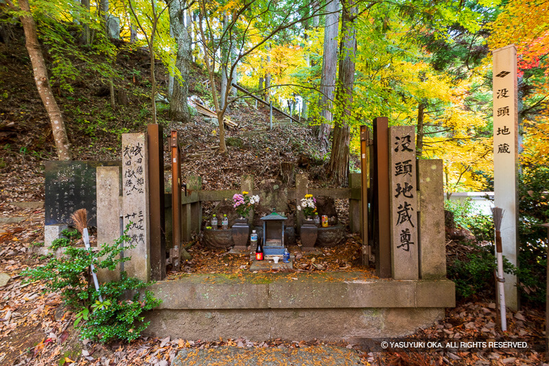 武田勝頼の墓は、甲州市大和町田野の景徳院境内に所在する。天正10年(1582)、勝頼は新府城を退き、天目山へ向かう途中、田野で包囲を受け、夫人・北条氏、嫡子・信勝とともに自刃した。徳川家康は武田家への敬意からこの最期の地に景徳院を建立し墓碑を整えた。境内には、勝頼・北条夫人・信勝の没頭地蔵尊(写真)や首洗池が残り、武田家終焉の地として静かに往時を伝えている。