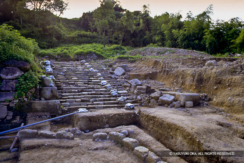 日野江城二の丸で発掘された直線状の石階段。