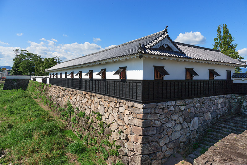 胸川際に建つ人吉城、胸川の対岸からの風景が土塀も写り風情が良い。涼しい風景撮影するときは、川面に映える姿も美しいのでフィルター使いも工夫したいところ。人吉城内の散策では、石垣の隅部をうまく構図入れて石垣の美しさを捉えてみよう。