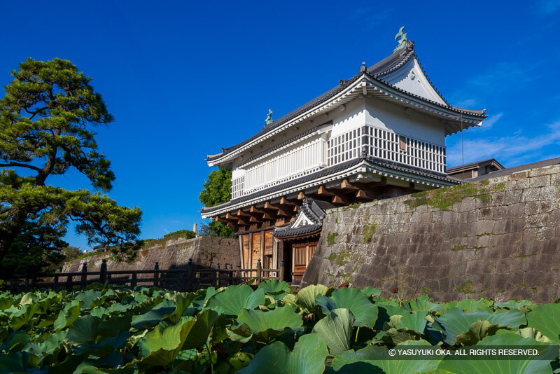 御楼門の水堀は蓮が植えられている。この風景を狙うなら、蓮の開花時期は、6月中旬から7月にかけて。