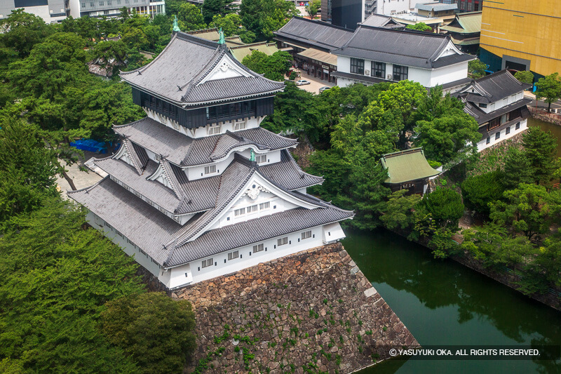 天守や本丸御殿は、天保8年(1837)に焼失する。翌年、本丸御殿は再建されるも天守は再建されなかった。幕末期の小倉城は、幕府側の前哨基地となっており、慶応2年(1866)、第二次長州征討で孤立した小笠原藩が自ら城に火を放ち退去している。この時、すべてが焼け落ちたという。天守の構造は特異で、最上階が上下二段に分かれ、上方が張り出す「唐造り」であった。これに影響を受けた城は、津山城、高松城、米子城の四十櫓がある。残念ながらいずれも明治期に解体されている。