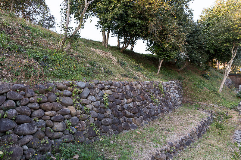 奥平家菩提寺の自性寺周辺には、南北150m、東西230m、高さ約5mの外堀のおかこい山が残る。