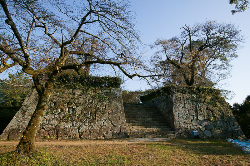 二ノ丸から見た本丸一之御門跡。両脇には櫓が達ち、石階段の上に一之御門があった。