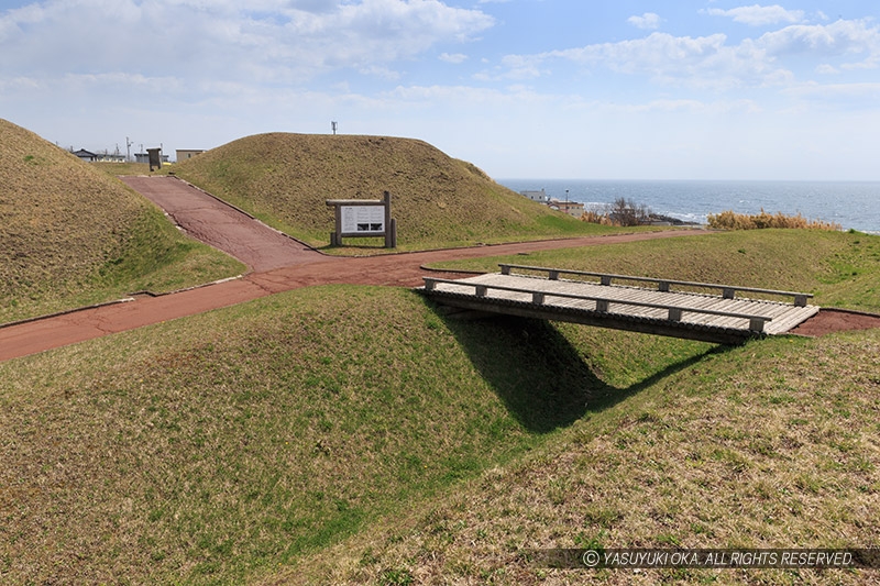 ここは以前から是非訪れてみたいと思っていたところです。よくこの志苔館の航空写真を見ましたが、その土塁がきれいに残っているのに感心したものです。それで実際に自分の目で見てみましたが、本当にきれいな土塁でした。ここも四稜郭とともに土塁好きの方にはおすすめです。この志苔館は、いわゆる「道南十二館」の一つで、長禄元年(1457)のコシャマインの戦いの際は、小林良景が館主でしたが、アイヌの攻撃で落城しました。その後再築され良景の子弥太郎良定が館主となりました。しかし、永正9年 (1512)のアイヌの攻撃で再び落城し、良定は戦死し、志苔館は廃館となったようです。