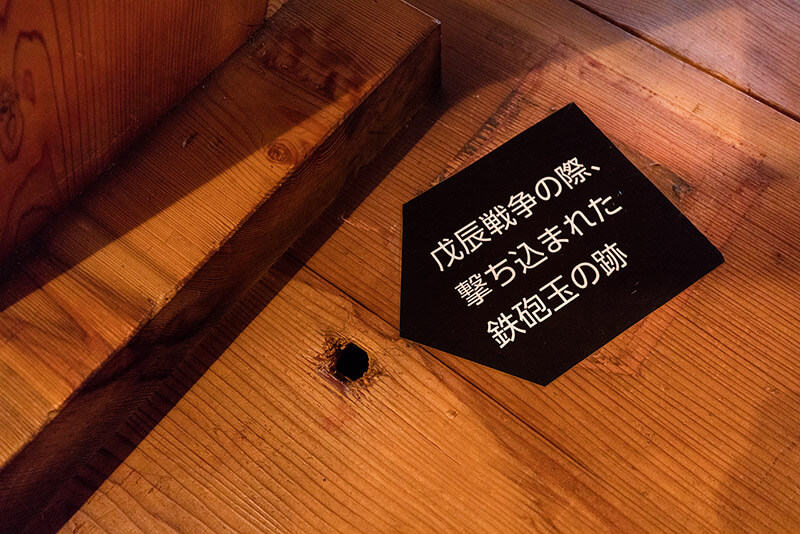 再建された御三階櫓には戊辰戦争の際、激戦地となった杉の古木を使用している。その古木には多数の弾痕があったらしく、実際、城内の柱や床板にもその痕跡を見ることが出来る。ちなみにそのあとは分かり易く「ここが弾丸のあと」と言うような感じで明示してある。