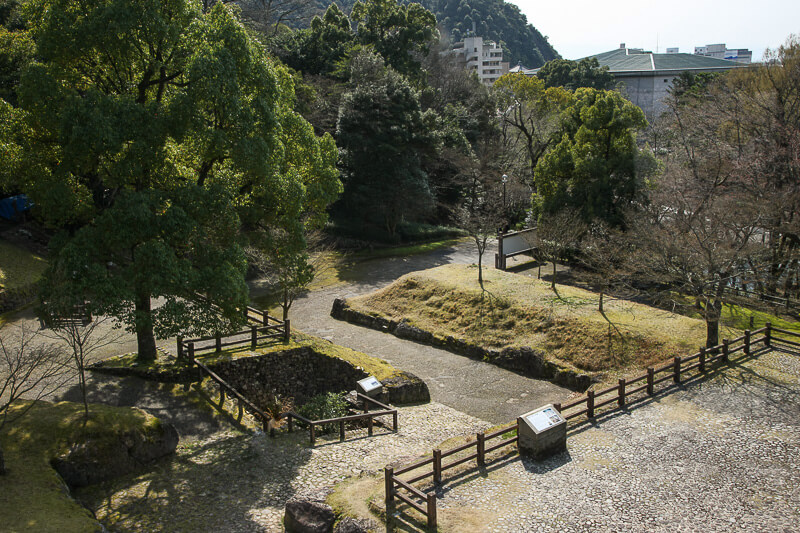 2018年には、石垣保護のため天守前の木々が伐採され眺望が良くなった(ページ冒頭の写真)。この石垣は戦国時代のものだ。一時的ではなく、今後はこの風景がずっと見られる。天守石垣前の紅葉樹以外は今後伐採の可能性がある。石垣は間詰め石がかなり抜け落ちているらしい。
