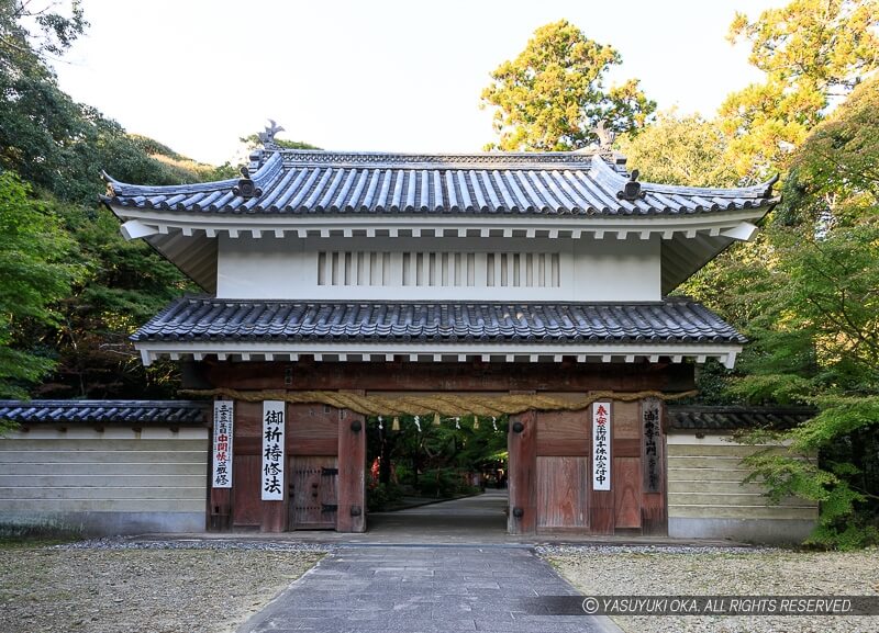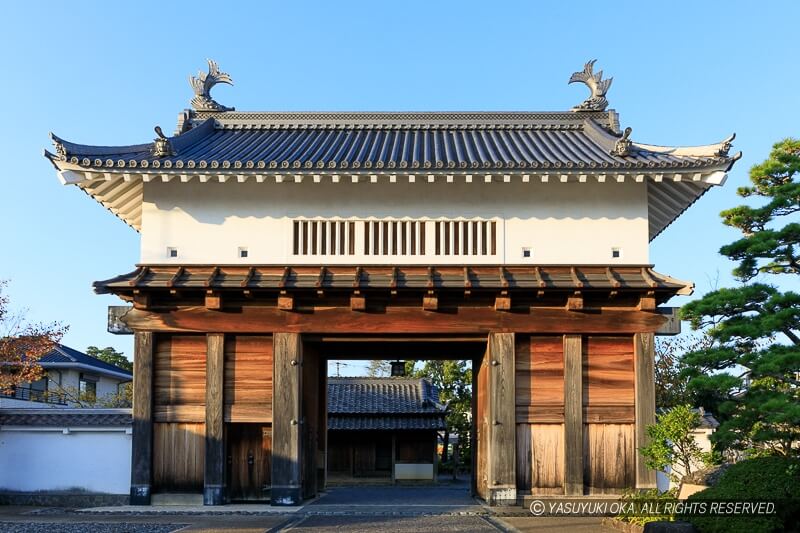 掛川城の大手二の門で万治2年(1659)に創建され、維新後にも何度か修理されたが、明治6年(1873)に、油山寺に移築され、昭和46年(1971)に、本来の姿に戻された。江戸初期の城門で堂々たる風格があるので、是非一度、訪れてみてほしい。たまに復元された掛川城の大手門のオリジナルとデザインが似ているため同じものと勘違いされがちだが、前述のように復元された大手門のオリジナルは火事で消滅している(油山寺には、「掛川城御玄関前大手二之門」と書かれた棟札が保管されている)。また、ついつい山門のみ見て帰りそうだが、油山寺の三重塔は国宝なので見ておいても良いかも。油山寺は眼病封じの寺として知られている。
