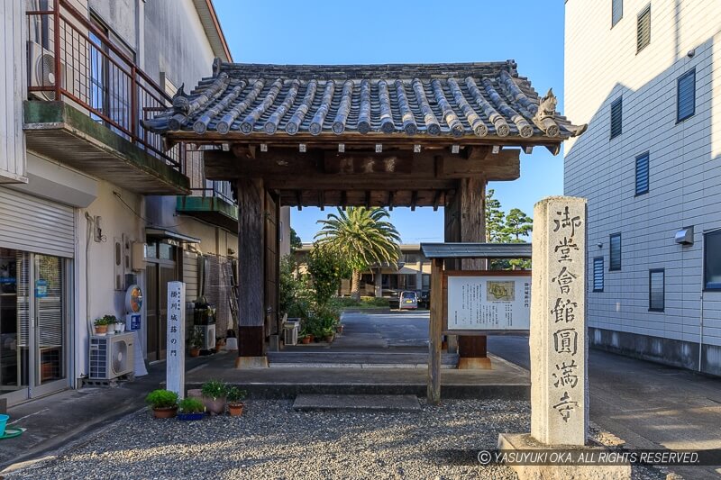 掛川城の内堀(蓮池)のほとりにあった城門で、小さいながら本丸や二の丸へ至る要所にあった。明治5年(1872)に円満寺が買い受けて、移築現存している。なお移築時に柱を約76cm切って山門にしたため、当時はもう少し高さのある城門だったらしい。山内一豊縁の寺なのだとか。