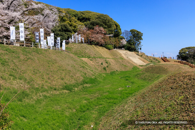 南麓には、一部復元された二重の土塁と空掘が見られる。春は桜が美しい。