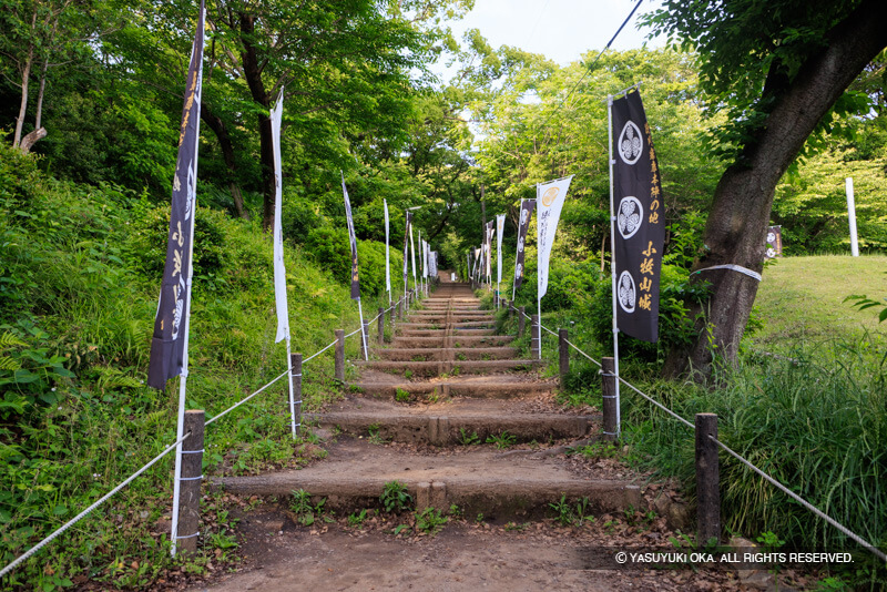山の南側から登る直線的な大手道。中腹で右へと折れて主郭へと至る。